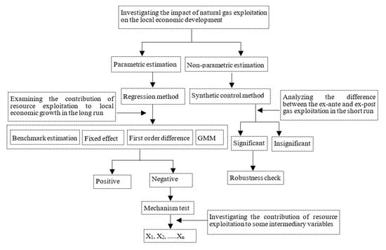 This study adopts both parametric and non-parametric methods to evaluate the contribution of natural gas exploitation to local economic growth. Figure 2 outlines a methodology mind-map. First of all, regression models are used for parametric estimation to investigate how extent natural gas exploitation contributes to the provincial economy of Sichuan. We conclude whether the contribution is positive by comparing results from three models: fixed effect, first-order difference, and generalized method of moments (GMM), and comparing them with those from the benchmark model. Secondly, the Synthetic control method as the non-parametric estimation is used to evaluate the difference in the local economic performance between the ex-ante and ex-post gas events in Dazhou city. Then, a robustness check follows to confirm the results. Thirdly, following the regression results, a mechanism test is adopted to investigate how extent the gas event is associated with some intermediary variables that may indirectly impact the local economic performance in the long run.