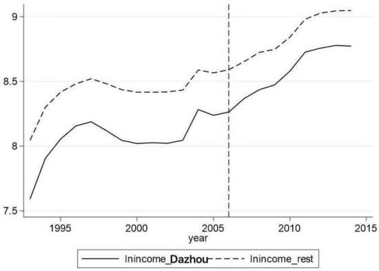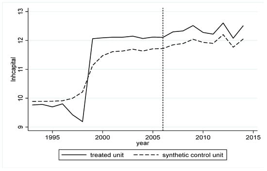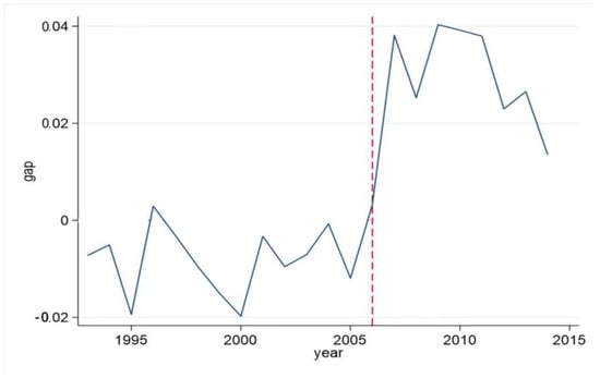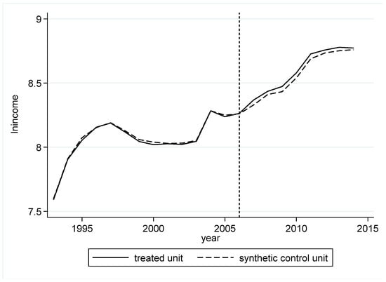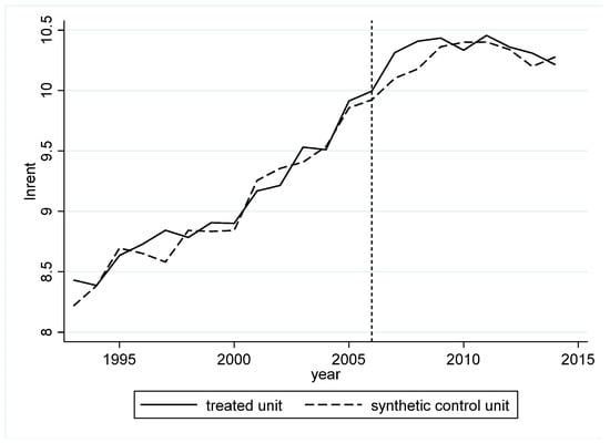 Based on the weights, the control group is synthesized. The fitting trend of the real Dazhou and the synthetic cities is presented in Figure 4. It shows the logarithmic growth trend of per capita real output in Dazhou compared with that obtained by the SCM. The solid line represents the growing trend of the real output per capita in Dazhou. In contrast, the dotted line represents the increasing real output per capita trend in the synthetic cities. The vertical dotted line represents the time node of the city’s natural gas well development and utilization. Before the natural gas event, the two paths almost wholly overlapped, and the synthetic cities almost copied the real growth path of Dazhou. After 2006, the gap between the real city and the synthetic cities gradually widened, and the growth path of the synthetic cities was slightly lower than that of the real city.