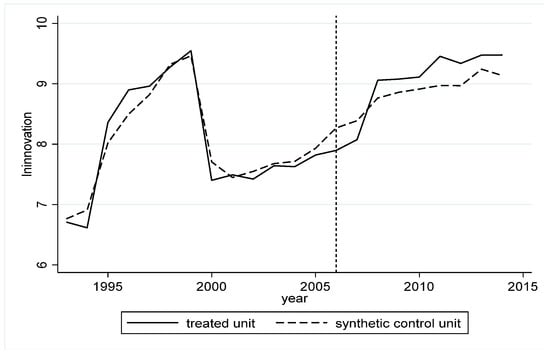 Innovation positively enhances regional production capacity and promotes regional economic development in the long run [51,52]. Including innovation as an explained variable and others as the control variables, this study uses the composite control method to investigate the impact of resource development on innovation.