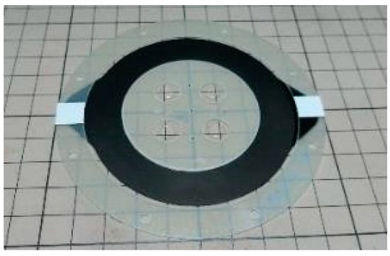 The DE cartridge used in the experiment was a circular type with an outer diameter of 100 mm and a DE diameter of 80 mm (see Figure 2). The elastomer used for the DE was processed from a 3M acrylic sheet (VHB4905, thickness 0.5 mm). At that time, prestrain of 100% was given. The point to note here is that the elastomer sheet often has micro-un-uniformities, so in this experiment, the sheet was placed on a horizontal workbench, and a weight was placed on it for a while to remove local distortion. []. The spacers on the outside and the center of the DEG cartridge were made by processing a hard acrylic sheet with a thickness of 5 mm.