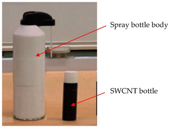 Spray bottle body and SWCNT bottle for spraying SWCNTs. To use the bottle containing SWCNTs on the right side, it is inserted it into the plastic tube (see arrow) of the spray body.