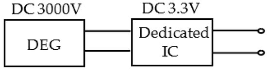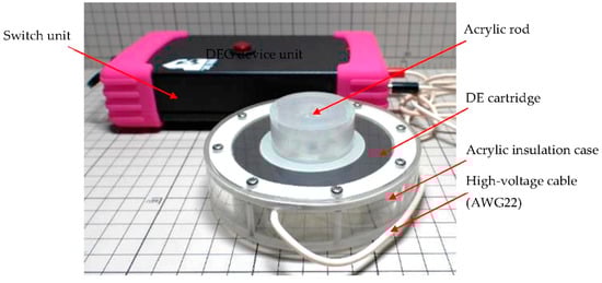 Figure 16 shows an overview of the small DEG device. The small DEG device consists of a device unit in which a DE cartridge (see Figure 2) is mounted in an acrylic insulating case, and a switch unit that connects to the load only during power generation. Since the small DEG device uses a high voltage of about DC3000 V, the device part was manufactured using acrylic as the main material in consideration of insulation.