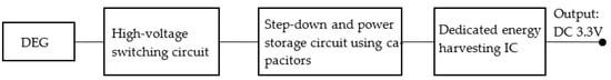 Commercially available step-down DC/DC converters (5 V, 12 V, and 24 V outputs) were examined. We first considered a method of directly supplying the output from the DEG to a DC/DC converter connected in series. Next, we examined/improved the method of constant voltage using a Zener diode, a direct conversion IC, or an energy harvesting-dedicated IC after stepping down to several V using a capacitor.