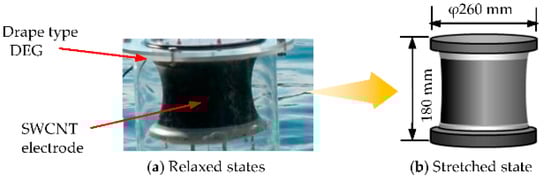SWCNT was used to increase the amount of energy generated by the DE cartridge. The following is the DEG energy generation data for wave energy generation that supports it. A Drape type with a height of 120 mm and a diameter of 260 mm (see Figure 19) could support a DE cartridge by changing the type of electrode material. A DEG was created and an energy generation experiment was conducted. Table 1 summarizes the amount of energy generated when the DE is pulled by about 60 mm []. The elastomer weight of the drape type DEG was 4.6 g, acrylic material was used, and carbon black, MWCNTs, SWCNT, and high crystal SWCNTs were used as the electrode materials. The amount of energy generated using carbon black was 284 mJ. Changing the electrodes to MWCNTs or SWCNTs will allow more energy to be obtained, as shown in Table 1. This is because the conductivity of MWCNT and SWCNT is higher than that of carbon black. As a result, as shown in Table 1, in the energy generation experiment using the SWCNT electrode, the amount of energy generation was about 2.3 times that of the carbon black electrode. High-crystal SWCNTs have produced about three times as much energy generation.