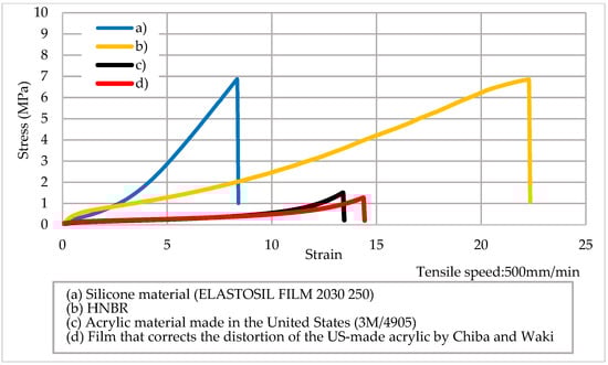 The results of SS curves of (a) the silicon (ELASTOSIL FILM 2030 250, shown in blue), (b) the HNBR ver.3 (orange line), (c) the acrylic material made in the United States (3M/4905, shown in black), and (d) the film that corrected the distortion of the U.S.-made acrylic (red line).