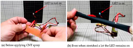 Ultra-flexible thin film electrode formation by SWCNT spray. (a) Elastomer (orange) before applying SWCNT spray. Naturally, the LED does not turn on. (b) After spraying the SWCNT, even if it is stretched considerably, the LED is still fully shining.