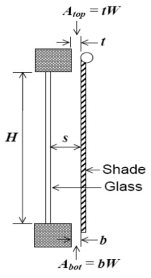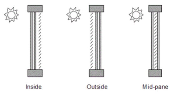 Shading in buildings, when applied to the building cavities, plays a key role in controlling the amount of solar radiation transmitted into the building; shading is also more efficient because cavities transmit the greatest amount of solar radiation inside the buildings [18,26]. The shading coefficient measures the building glass’s thermal performance; it is the ratio between a particular fenestration’s solar heat gain to that of a single clear glass that is 3 mm thick [27]. The shading coefficient must be considered when calculating cooling and heating demands [28] as this approach can help achieve significant energy savings throughout the year [29]. However, the measurement of the shading coefficient depends on the angle of incidence of solar rays. As this is not fixed, it is not possible to have a fixed shading coefficient [30]. Several studies have developed reliable calculation techniques for overcoming these challenges [30,31].