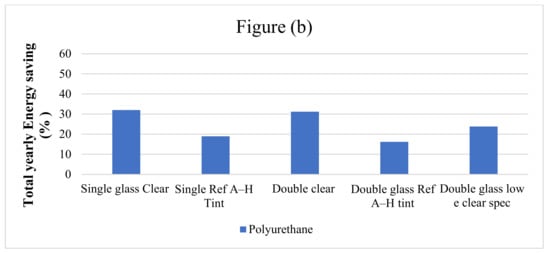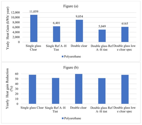 The impact of applying shutters with an embedded polyurethane insulation layer on the aforementioned glass types was trialed by applying a medium solar intensity of 189 W/m2 [50]. Figure 4a shows the annual total heat gain through the window by implementing window shutters of different window glass types whereas Figure 4b depicts the related yearly reduction.