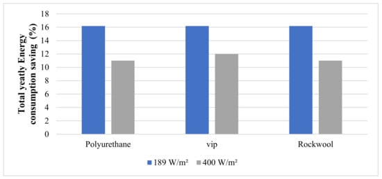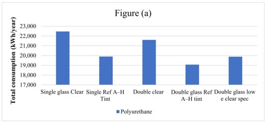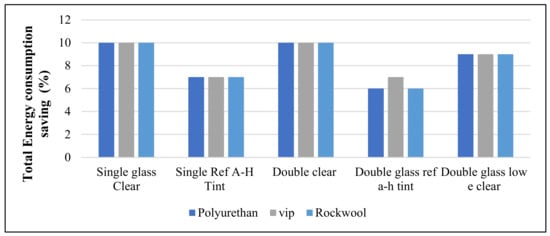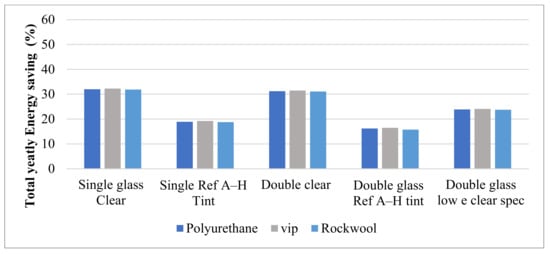 A test of the insulations of three alternatives was carried out on the base case: Polyurethane, vacuum, and Rockwool (Figure 6) with varying scenarios of glass type to denote the total consumption of energy along with the overall reduction after implementing windows shutters. The thermal conductivity of Rockwool and Polyurethane is 0.020 W/mK and 0.041 W/mK with the density being 32 and 65~160 kg/m3, respectively.