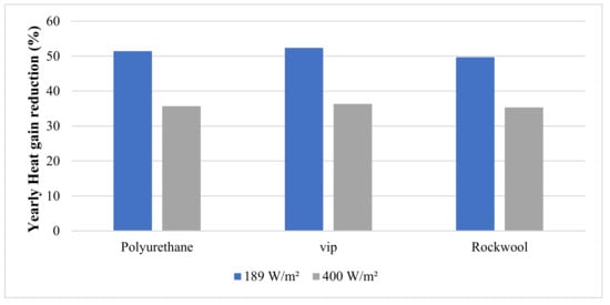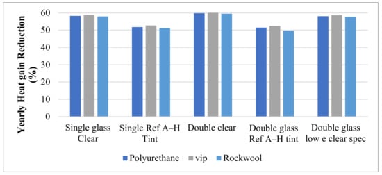 Figure 6 presents the annual decline in the overall heat gain via the studied building’s different types of window glass after implementing three types of insulations of window shutters: Polyurethane, Vacuum, and Rockwool.