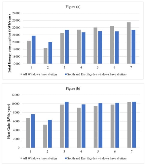 Two methods of evaluation—annual heat gain via the windows and the selected buildings’ total energy consumption—were implemented to evaluate the application of external window shutters.