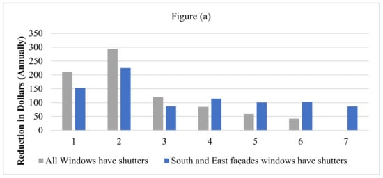 Figure 7 shows the correlated annual overall energy savings of the building after implementing various windows glass types after the integration of the three types of window shutters’ insulations mentioned above. Results show that double glass with a reflection tint provides the best performance. The remaining analysis was conducted on shutters with this type of glazing.