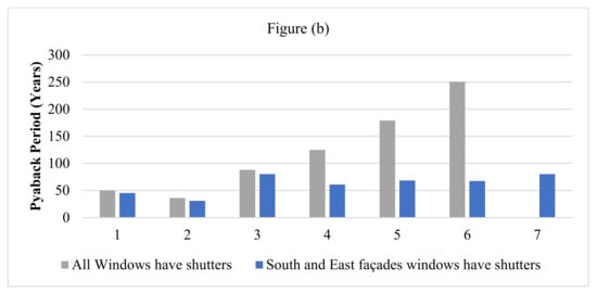 The testing of two solar radiation control strategies by specifying low and high setpoints was carried out: low 189 and high 400. The average decline for low set point of solar intensity (189 W/m2) was 51% while for high set point of solar intensity (400 W/m2), it was maintained at 36%, as per Figure 8. This trend was found to be similar for all types of insulations of window shutters. However, the VIP type exhibited a higher percentage of reduction. In addition, a simulation run was conducted to reveal the differences in heat addition and energy consumption, after implementing the glare with index 18 into different types of window glass, which caused the overall energy savings to be around 6% in the case of double glass and 10% in the case of single clear glass (Figure 10). Previous studies’ findings have confirmed that the difference between the implemented insulations into the window shutters is insignificant due to the effect of thermal bridging around the window. Furthermore, it is worthwhile to note that the simulations were run for individual window units and not taking into consideration the building. The overall energy reduction was tested while applying the shutters to all windows of the building when compared with implementing them only on west and south facades. According to the comparison, no major difference was seen in the total energy consumption. A cost analysis for the insulation type inside the shutters did not reveal any major differences in the overall energy consumption after selecting a high or medium thermal insulation. However, when considering cost factors, medium insulation Rockwool was shown to be ten-fold more expensive, as depicted in Table 6. Upon additional analysis of the windows shutter’s application case scenarios, all windows were found to have shutters whereas the assessment of only south and east windows have shutters were conducted, as shown in Figure 11. Concerning the Rockwool insulation using different mechanisms, no differences were found with respect to cost decline.