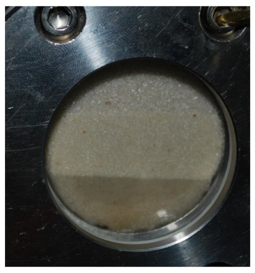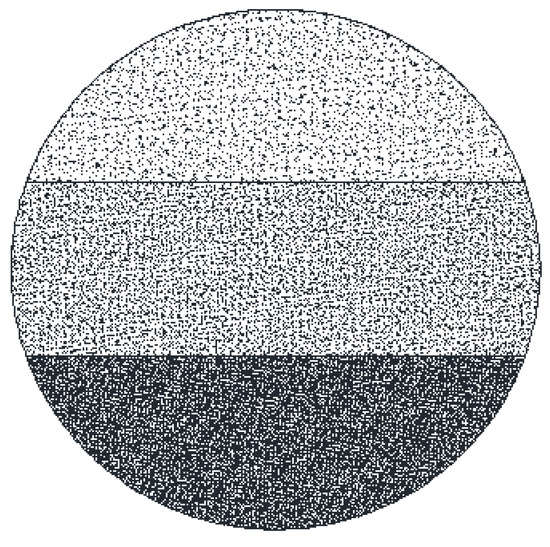 The boundary of layers with different permeability are clearly visible. The size of the model is close to the size of the visible window, with a diameter of 10 cm and a thickness of 1.0 cm. The overall seepage characteristics of the model and the migration law of the gas–oil interface can be viewed from a distance with a strong light source. Meanwhile, the microscopic flow of local pore oil can also be observed and recorded through a high-speed camera. The schematic diagram of the model and real products are shown in Figure 1 and Figure 2, respectively.