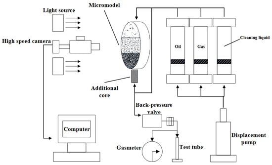 The experimental apparatus is the high-temperature and high-pressure microscopic visual oil displacement device independently developed by the Research Institute of Petroleum Exploration and Development, which is mainly composed of four systems: pressure control system, microscopic model system, image acquisition, and analysis system, and auxiliary system. The process diagram is shown in Figure 3.