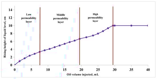 By geometric calculation, the volume of the high, medium, and low permeability layers was obtained as 22.917 cm3, 32.666 cm3, and 22.917 cm3. Combining the data in Table 1, the pore volume of each layer was obtained as 10.262 cm3, 12.616 cm3, and 8.055 cm3, respectively. Therefore, the total pore volume of the model was 30.933 cm3 and the proportions of pore volume in high, medium, and low permeability layers were 33.17%, 40.79%, and 26.04%, respectively. According to the experiment design, the oil saturation process is carried out from the bottom to the top. The interface migration process is shown in Figure 4. The red dotted line shows the boundaries of high, medium, and low permeability layers, and the yellow dotted line is the saturated oil interface. High, medium, and low permeability layers have different light transmittances. The high permeability layers have strong light transmittance and the low permeability layers have weak light transmittance. In order to clearly observe the saturated oil interface, the backlight intensity should be adjusted in time during the oil saturation process. As shown in Figure 4, the saturated oil interface migrated evenly and steadily from the bottom to the top with basically no fingering phenomenon, and the final oil saturation was relatively sufficient. As shown in Figure 5, the relationship between the rising height of the saturated oil interface and the amount of injected oil was established. Since the model was circular, the rising height of the liquid level and the amount of oil injected were not linear. Kerosene was evenly saturated along the low permeability layer, medium permeability layer, and high permeability layer in turn. This is because, on the one hand, the speed of saturated oil was slow, which gives full play to the gravity properties of kerosene. On the other hand, there was only one fluid, with no mobility difference between different fluids in the model. Table 2 shows the final saturated oil profile for each layer. The model actually contained only a few dead pores because it was a sand-filled model. The kerosene was sufficiently saturated and the total oil saturation reached about 95.37%.