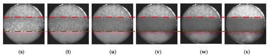 The lower the permeability of the layers, the worse the light transmission performance. In order to clearly observe the migration rule of the gas–oil interface, the light was brightened twice at the moment (o) and (r). Images (o)~(u) show that the process was similar to the self-adjustment of the high-permeability layer after the gas reached the boundary of the medium and low permeability layers. The difference was that the pore volume of the medium permeability layer was larger than that of the high permeability layer, and the self-adjustment duration was longer than that in the high permeability layer.
