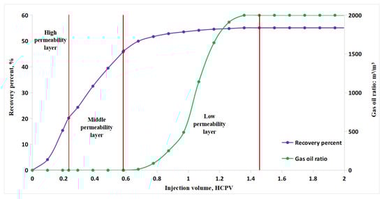 The relation between the production degree, gas–oil ratio and injection volume in the process of CO2 injection is shown in Figure 7, and the production degree of each rhythm layer is shown in Table 3. When the injection volume was 0.23 HCPV, the injected CO2 was self-adjusted in the high permeability layer and the recovery degree was 20.21%. Then the injected CO2 permeated and displaced the oil in the medium permeability layer. When the injection volume was 0.59 HCPV, the injected CO2 was self-adjusted in the medium permeability layer, and the total recovery degree was 46.22%. Later, the injected CO2 migrates into the low permeability layer to displace the oil. When the injection volume was 0.68 HCPV, there was a gas breakthrough happening at the bottom of the model and the recovery degree was 49.97%. After that, the gas–oil ratio increased rapidly and the oil production decreased. When the injection volume was 1.45 HCPV, the model basically could not produce oil anymore and the ultimate recovery efficiency was 55.13%.