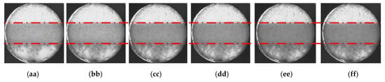 In order to fully reflect the gravity differentiation between CO2 and oil, CO2 was injected from the high permeability layer at the top and the gas injection rate was set as small as possible (0.1 mL/min). The high-speed camera recorded the gas–oil interface migration process at different moments, as shown in Figure 6. As we can see in the Figure, CO2 is darker than oil in color. Then analyzing the image carefully, the gas–oil interface migration laws can be summarized as follow.
