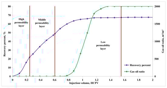 After increasing the flow resistance with the supplementary core, the relationship in GAGD between the recovery degree, gas–oil ratio, and injection volume is shown in Figure 9, and the recovery degree of each rhythm layer is shown in Table 4. When the injection volume was 0.24 HCPV, the injected CO2 was self-adjusted in the high permeability layer and the recovery degree was 21.79%. Then the injected CO2 penetrated into the medium permeability layer to displace the oil. When the injection volume was 0.60 HCPV, the injected CO2 was self-adjusted in the medium permeability layer and the total recovery degree was 48.72%. Later, CO2 continuously flowed into the low permeability layer for oil displacement. When the injection volume was 0.78 HCPV, there started to be CO2 breakthrough at the bottom of the model and the recovery degree was 59.81%—after that, the gas–oil ratio increased rapidly and the oil production decreased. When the injection volume was 1.55 HCPV, the model basically could not produce oil anymore and the ultimate recovery efficiency was 67.51%.