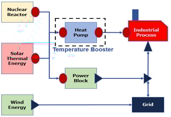 Researchers have been attracted to the integrated energy systems (IESs) in recent years due to their potential to reduce GHG emissions, improve energy efficiency, and electrical grid dependability, and enhance energy economics. IESs are collaboratively controlled systems that can dynamically apportion thermal and/or electrical energy to promote the production of various energy products while also providing responsive generation to the power grid. Multiple subsystems make up an IES, which may or may not be geographically co-located [1,2]. IES configurations are likely to help nuclear energy overcome its primary challenge, cost, which has resulted in the relatively limited expansion of nuclear power according to a recent MIT Future of Nuclear report [3]. In order to realize the benefits of integrated nuclear-renewable energy systems (INRESs) with the current reactor fleets enabling them to provide process heat and improve economics as shown in Figure 1, selection and development of a complimentary temperature upgrading technology is necessary. Thermal energy can be used to generate power, be stored for later conversion to electricity, or be used in industrial thermal processes. In response to changing electric market conditions, this energy distribution can be modified to maximize the value of the IES. Solar thermal and nuclear power are becoming less appealing to investors as the price of electricity fluctuates due to the prioritization of renewable energy sources such as solar photovoltaic electricity and wind power. These high temperature energy generators facilities minimize greenhouse gas emissions, but they come with high upfront investments that are difficult to recoup rapidly in a fluctuating energy market. While thermal energy storage at times of lower electricity demand and later conversion to power under high demand conditions is a component of the solution, there is also a chance to sell heat instead of power when it is more profitable.