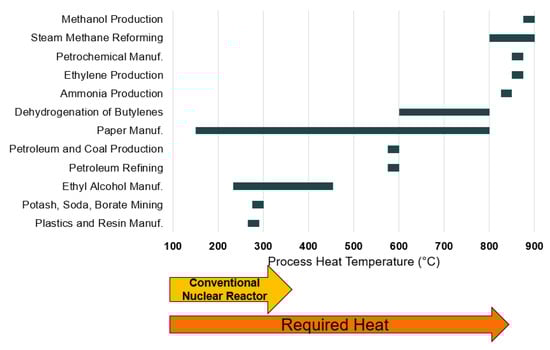 McMillan et al. [4] gathered data on thermal energy consumption and CO2 emissions for high-temperature thermal process businesses in the United States in 2016. They discovered that boilers or combined heat and power accounted for 70% of the 51 TBtu consumed in the US industrial sector in 2014, while direct process heating accounted for another 24%. Fossil fuels (mainly natural gas) are readily available, affordable, and simple to utilize; therefore, they are commonly used to generate the requisite high temperature heat. Instead of fossil fuels, using nuclear or renewable thermal energy for these applications can significantly reduce greenhouse gas (GHG) emissions. This also opens the possibility of using energy sources other than electricity, which isn’t always feasible due to fluctuating electricity prices. Conventional nuclear reactors operate at 300–325 °C, whereas the high temperature thermal industrial processes typically require heat at greater than 550 °C as shown in Figure 2. To address the temperature mismatch, a heat pump is used between the nuclear power plant and the desired high temperature needed by industrial process.