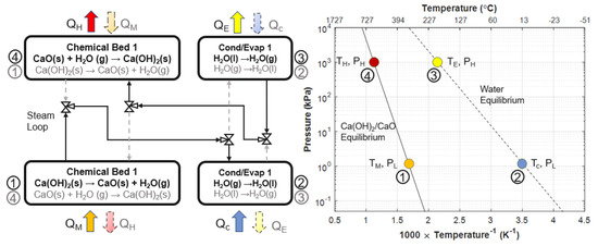Schematics of components of Ca(OH)2/CaO ChHP system; Clausius–Clapeyron diagram (①–④ are the reaction conditions corresponding to the figure on the left).