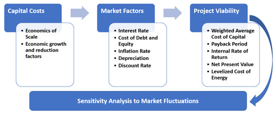 The general methodology used to assess the techno-economic feasibility of a system is shown in Figure 4. The first stage is to estimate the capital costs of the system. In next step, possible market and utility factors are evaluated. Finally, the necessary economic indicators are calculated to determine the techno-economic feasibility of the system or project. This section describes the evaluation of economic indicators, specific capital cost and baseline schematic of ChHP with SMR.