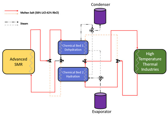 The schematic of the baseline model used in this study is shown in Figure 5, where a ChHP is integrated with advanced an SMR to deliver heat to high temperature thermal industrial processes. This flow sheet shows the major components of the techno-economic model. The system uses thermal energy from the advanced SMR via molten salt as heat transfer fluid and delivers it to chemical bed which contains Ca(OH)2 for the dehydration process. In the dehydration bed, Ca(OH)2 decomposes into CaO in an endothermic reaction liberating water vapor. The molten salt returns back from the dehydration bed and is reheated in a closed loop. The liberated water vapor from dehydration bed is condensed in a condenser. At the same time a high-pressure steam from the evaporator is pumped to chemical bed 2 which reacts with CaO to form Ca(OH)2 in an exothermic reaction. This is the hydration step and the temperature in the hydration bed is higher than the temperature in the dehydration bed. According to Clausius–Clapeyron equilibrium relation, higher pressure dictates the higher temperature. The heat from the hydration bed is removed using molten salt which is sent to the high temperature thermal industrial processes. This salt is again sent back to the hydration bed. This process is a continuous, and once the bed is dehydrated, it is ready for hydration and vice-versa.