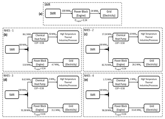 Advanced SMR and SMR-ChHP combined scenarios (a) base case SMR generating electricity; (b–e) SMR-ChHP coupled system generating heat and electricity in different proportions.