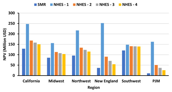 Based on the utility prices assumed for six different U.S. regions, economic indicators for SMR, NHES-1, NHES-2, NHES-3, and NHES-4 were evaluated as described in Section 2.4. Figure 7 shows the NPV values of advanced SMR and SMR-ChHP output scenarios. All the nuclear hybrid energy systems have higher NPV values then SMR for every region because of higher sales revenue. As per NPV estimates, it is observed that selling heat from NHES-1 with a 50 MWth output is most profitable compared to lower thermal output ChHP or selling electricity from a 100 MWth advanced SMR. New England and PJM regions NPV values of USD162 and USD251.8 million shows the best case for selling heat for high temperature industrial processes because of their high natural gas and low electricity prices as per the percentage increase in NPV values compared to an SMR in their region.
