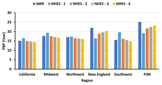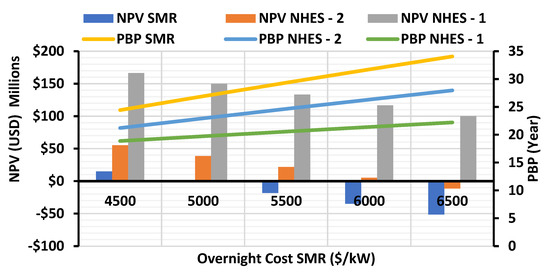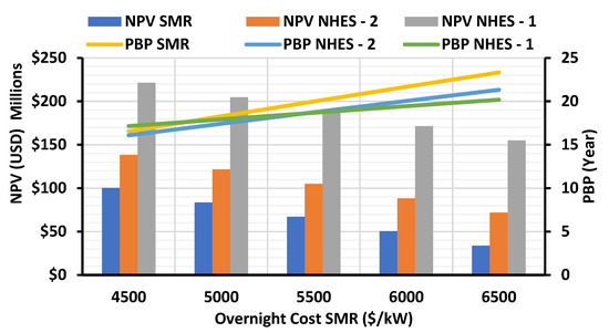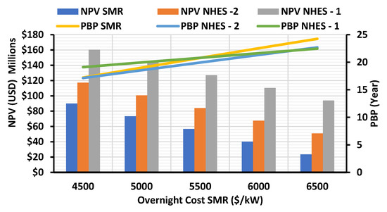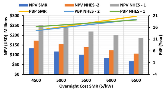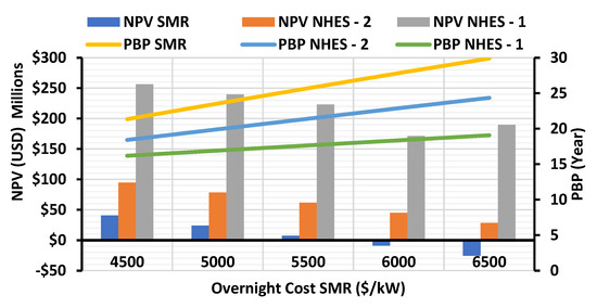 Figure 17 and Figure 18 show the NPV and PBP values at different overnight capital cost of advanced SMR for New England and PJM, respectively. Based on New England and PJM utility prices, NHES-1 will always have lower PBP when compared with NHES-2 and advanced SMR with increased overnight capital cost though the individual system PBP value will increase. NPV of both the regions are significantly higher for NHES-1. If the overnight capital cost is increased above USD5500/kWe and USD5000/kWe for New England and PJM, respectively, then NPV of SMR will become negative making SMR not profitable. In this case, the system will be economically profitable if SMR is coupled with ChHP and sells heat and electricity.