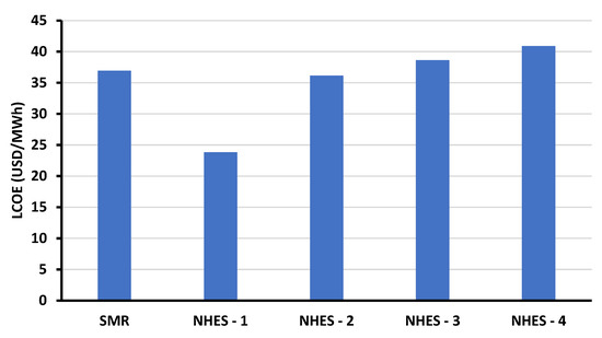 The Figure 12 shows the LCOE values for SMR and NHES systems for different scenarios. The LCOE for advanced SMR is 36.93 USD/MWh whereas the different coupled SMR-ChHP scenarios have LCOE values 23.85, 36.14, 38.62 and 40.88 USD/MWh for NHES-1, 2, 3, and 4, respectively. NHES-1 has lower LCOE when compared to advanced SMR making NHES-1 a better investment as SMR-ChHP system is producing more energy than advanced SMR and overcomes the cost of the coupled system well. NHES-2 has slightly higher LCOE value compared to advanced SMR signifying that selling heat and electricity via coupled system balances out the cost of SMR-ChHP. NHES-3 and 4 have higher LCOE as the cost of the system does not balances out the energy produced by the coupled system.