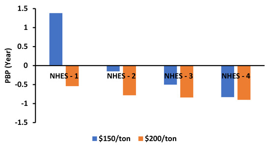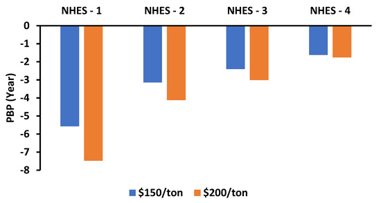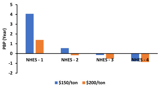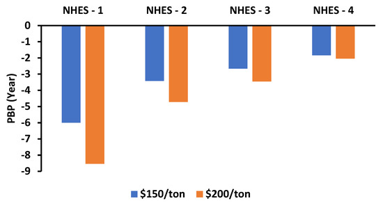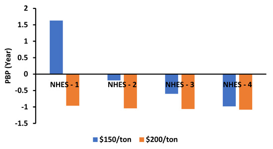 The payback period (PBP) is the length of time required to recoup the funds expended in an investment, or to reach the break-even point and is calculated using the following Equations (4)–(6) where PBP is the payback period, V denotes the fixed capital investment, denotes the average yearly cash flow over the project’s lifetime, Aj is the annual cash flow or annuity in year j, N denotes the project’s length in years, s represents sales, c0 represents cost, d represents depreciation, represents the corporate tax rate and j denotes a specific year [37].
