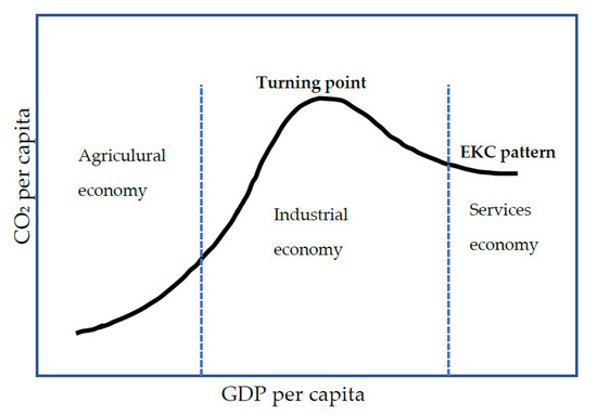 This study follows earlier research on CO2 emissions and uses panel data methods for a sample of 48 countries over the period 2000–2018 to model the relationship between renewable energy, industrialization, and CO2 emissions. We use this time frame because Eastern Europe and Central Asia countries have undergone economic transition reforms with the collapse of the Soviet Union and experienced substantial economic shocks in the 1990s. Our empirical model is based on the EKC framework. The environmental Kuznets curve posits that there is a quadratic relationship (inverted U-shaped) relationship between GDP per capita and CO2 emissions (Figure 1).