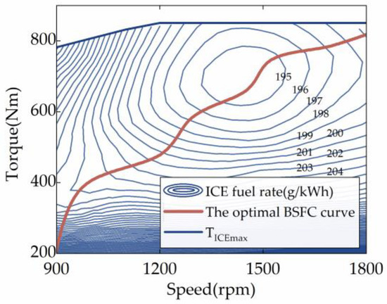 Furthermore, the ICE may be controlled to work in any condition because the investigated HEUB can doubly decouple the ICE speed and torque by employing a planetary gear set. In order to narrow the scope of the EMS’s optimization-seeking, the optimal braking specific fuel consumption (BSFC) curve of the ICE is extracted as a priori information in this work. Lian et al. have demonstrated that this method can significantly shorten the DRL strategy’s learning period without sacrificing fuel efficiency [24]. The optimal operating curve of the object ICE is shown in Figure 2, which consists of the set of operating points with the lowest BSFC at each ICE power, . Additionally, since the electric motor’s efficiency is far higher than the ICE’s, the ICE can be the primary focus of energy management improvement.