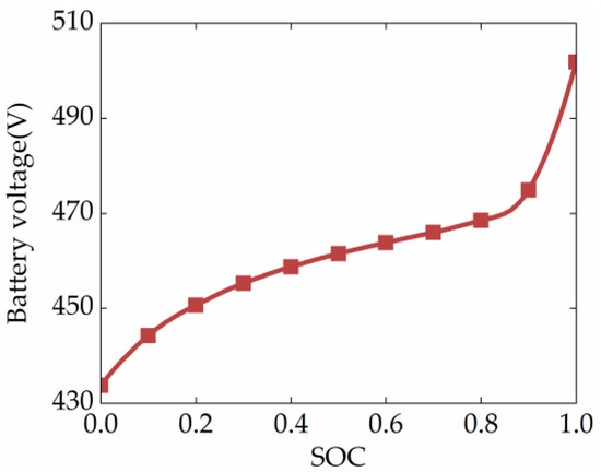 The power battery pack is simulated by a first-order equivalent circuit model, which is practical and effective for energy management problems [36]. The voltage characteristic curve of the battery is shown in Figure 3, which shows that the open-circuit voltage depends on the battery’s state of charge (SOC). In addition, since the open-circuit voltage changes more gently when the SOC is around 0.6, the initial SOC of the HEUB simulation is set to 0.6, and the SOC constraint range is set to [0.5,0.7] in this study. The theoretical battery model is formulated as: