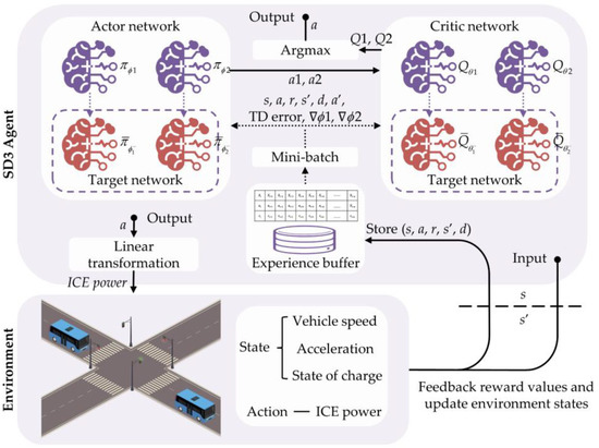 Since the energy management problem of HEVs is a sequential control problem, it can be mathematically described as an MDP. In the energy management MDP, the driving cycle and the powertrain system are part of the environment. The DRL algorithm searches for an optimal strategy that satisfies the energy optimization objective by trying different torque distribution strategies. This section proposes a novel DRL-based strategy, namely the SD3-based strategy, and its algorithm principles and formulation details are presented in detail.