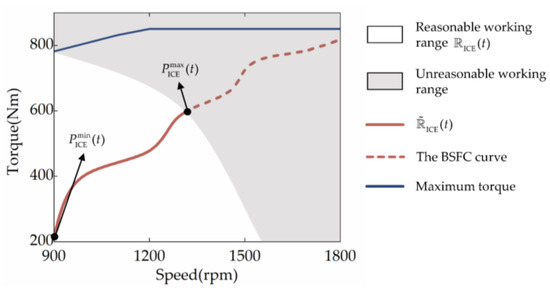 In the studied powertrain, MG2′s role is to share the ICE load or charge the battery by brake recovery, so it must have a wide physical operating range to ensure a perfect match with the ICE. Instead, the MG1′s role is to regulate the ICE speed or absorb some of the ICE power to produce electricity. Hence, its physical operating range can be relatively narrow. Given this, the studied HEUB is equipped with a high-power motor MG2 and a low-power motor MG1 for the ICE. Nevertheless, Equation (2) states that when the ICE’s demand speed or torque is too high, the demand speed or torque of the MG1 is also likely to be too high, which would cause the MG1 to violate Equation (5). Namely, the ICE should only operate within a specific range at each time step t to guarantee the reasonable operation of MG1. This indicates that the output action of the SD3 should fall on , the part of the BSFC curve that intersects with . Meanwhile, because the BSFC curve’s speed and torque are positively associated, the higher the power at each point, the higher the speed and torque. Therefore, is continuous, as illustrated in Figure 5, with the upper limit of the maximum feasible power and the lower limit of the minimum feasible power . In conclusion, the output action of SD3 should be limited to and .