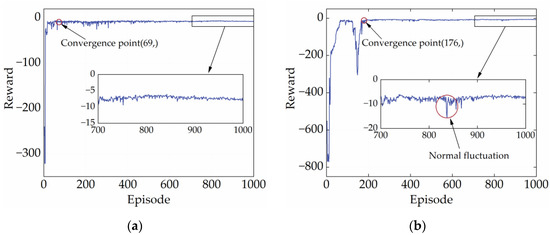 High-quality and stable convergence performance is a reflection of the powerful learning performance of the DRL strategy. Generally, the reward curve is the only metric to assess whether a DRL strategy converges. It shows how the total reward changes in each episode during the training process. In the early stages of training, reward values tend to be low and fluctuate widely. This is because the DRL strategy needs to explore both good and bad experiences. As experience accumulates, the reward value will gradually increase and eventually remain at a high point. Figure 7 illustrates the reward curves of SD3 under the two cycles. According to Figure 7, SD3 completed its early exploration for the CHTC-B and WVUCITY cycles after 69 and 176 episodes, respectively, and the reward value started to fluctuate modestly at the peak. It is important to note that the reward curve finally converges to a straight line, indicating that SD3 has very high convergence stability.