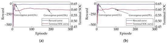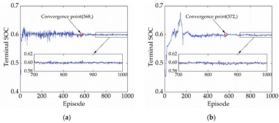 SOC maintenance is a vital control objective for energy management, so the convergence performance of the terminal SOC should also be a criterion to evaluate the convergence capability of the policy. Figure 8 depicts the variation of terminal SOC of SD3 during the learning process. According to Figure 8, the terminal SOC reaches convergence at 568 and 572 episodes under the CHTC-B and WVUCITY cycles, respectively. After, the terminal SOC fluctuates steadily around 0.6, with no value falling below 0.595 and no value exceeding 0.605. (criteria for judging convergence). Table 3 also displays the mean and variance of the terminal SOC for episodes ranging from 600 to 1000. It is evident that the terminal SOC variations after convergence are incredibly minimal, which serves as proof of the high-quality convergence of SD3. Furthermore, the terminal SOC does not converge when the reward curve does, highlighting the significance of employing the terminal SOC as a gauge for the convergence of the strategy.
