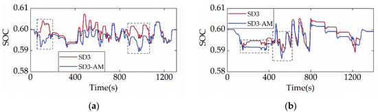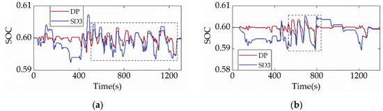 The analysis of terminal SOC convergence discussed above has been able to show that SD3 has a significant capacity for SOC maintenance. To further demonstrate the SOC planning capability of SD3, Figure 9 displays the SOC trajectories of SD3 and DP under two cycles. It is evident that the SD3′s battery does not exhibit overcharging or over-discharging, and the SOC can be tightly controlled to fluctuate only within a narrow range between 0.58 and 0.61. The battery can operate in the shallow cycle, and it is beneficial for improving the charge–discharge efficiency and reliability. Additionally, the SOC change trend of SD3 and DP are strikingly comparable in the boxed area of Figure 9, indicating that their charging and discharging rules are identical.