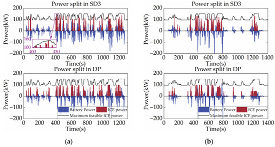 The power allocation of the power system can reflect the basic control logic of the strategy, including the operating mode switching logic and the engine control logic. Figure 10 shows the power split between the ICE and the battery and DP for SD3 under two cycles, with the black dotted lines in the figures representing the ICE’s maximum feasible power at each time step. As shown in Figure 10, the ICE power of SD3 is essentially not too low or too high, indicating that SD3 optimizes the operating point of the ICE by planning the energy allocation. This is because SD3 follows Bellman’s optimality theory and can plan for the entire driving cycle globally. Also, the SD3 tends to utilize more battery power when the vehicle is starting or moving at a low velocity. This control strategy is in line with engineering experience and contributes to the vehicle’s fuel economy. It is also noteworthy that the output power of the ICE never exceeds the maximum limit due to the filtering of the output action by SD3 using the AM technique, which demonstrates the excellent reliability of the proposed AM method.