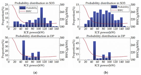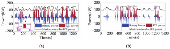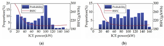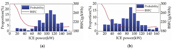 ICE power distribution under different driving cycles. (a) CHTC-B; (b) WVUCITY.