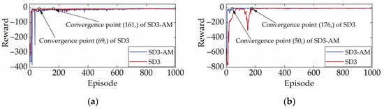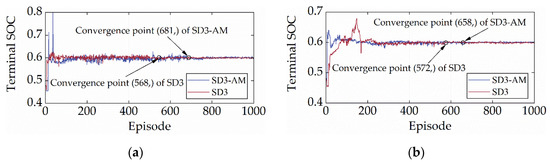 Figure 12 and Figure 13 display the reward and terminal SOC curves of SD3 and SD3-AM under two cycles, respectively. As illustrated in Figure 12 and Figure 13, the terminal SOC and reward values of SD3 and SD3-AM in the first episode are nearly identical, resulting from the identical random seeds used in both. In addition, Figure 12 shows that the reward curves for SD3 and SD3-AM after convergence overlap, which suggests that the maximum rewards they can earn are not much different. It also implies that AM does not impact the learning performance of SD3. Additionally, Figure 13 demonstrates that, under the CHTC-B and WVUCITY cycles, the convergence times of the terminal SOC of SD3 are 16.59% and 13.07% earlier than those of SD3-AM. It suggests that adding AM will considerably accelerate SD3′s learning rate. In conclusion, AM does not reduce SD3′s learning stability or speed. It is attributed to the fact that AM does not destroy the distribution of the environment, and thus does not violate the mathematical principles of SD3.