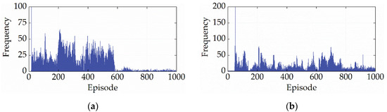 Figure 14 shows the number of invalid actions output by SD3-AM in each round during the learning process. From Figure 14, SD3-AM has difficulty avoiding outputting invalid actions. The first reason is that SD3-AM avoids falling into the local optimum by randomly exploring the entire action space, which puts the SD3 algorithm at risk of selecting invalid actions. The second reason is that SD3-AM will gradually master the highly-efficient control method for ICE during the learning process, i.e., controlling ICE to work in the low-BSFC region. However, the low BSFC corresponds to relatively high power, and the MG1 is easily overloaded when the powertrain system’s demand speed or demand torque is too high.