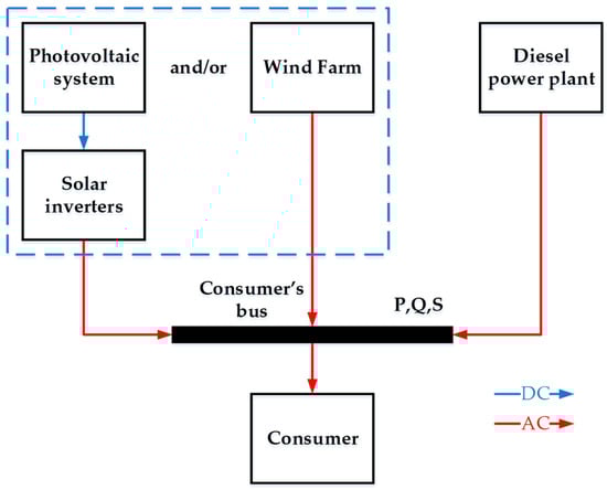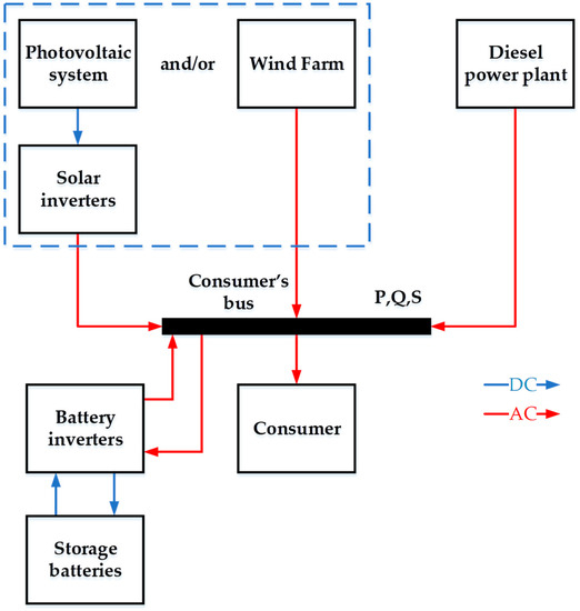 In practice, the following two schemes for the functioning of autonomous energy systems with renewable energy sources are most often used: (a) parallel operation of a diesel power plant and a photovoltaic system or wind farm (Figure 2); (b) operation of a hybrid energy complex with energy storage batteries (Figure 3).