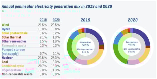 Peninsular Spain electricity generation mix in 2019 and 2020 (%) [7].