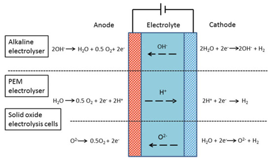 To maintain the charge balance, when a voltage is applied to the electrodes, electrons flow from the negative terminal (anode) to the cathode, where they are consumed (reduced) by protons to form hydrogen. At the same time, ions travel through the electrolyte to the corresponding electrode, where a reaction occurs, giving up electrons that return to the power supply terminal. The charges carried by the ionic compounds, such as OH¯, H⁺, or O2¯, move through the electrolyte to maintain the system electrical neutrality. According to the ionic conducting electrolyte, there are three types of electrolyzers: alkaline, proton exchange membranes (PEMs), and high temperature solid oxides (SOEs) [24], Figure 2.