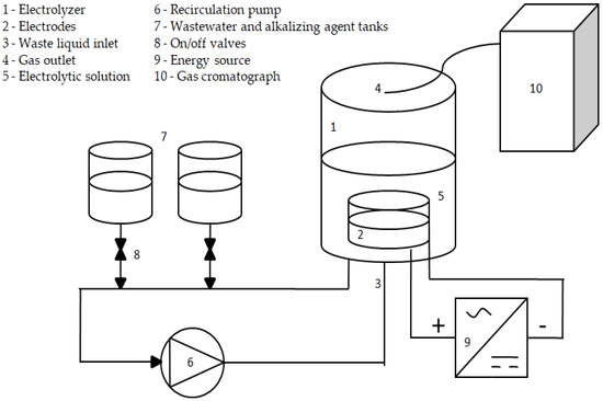 This section describes the components of the experimental system (Figure 3) and the hydrogen generation process. An own-design single-cavity reactor without a membrane (1) is used for the alkaline electro-oxidation of wastewater or simpler organic compound, as a better alternative to the existing patented approach [27].